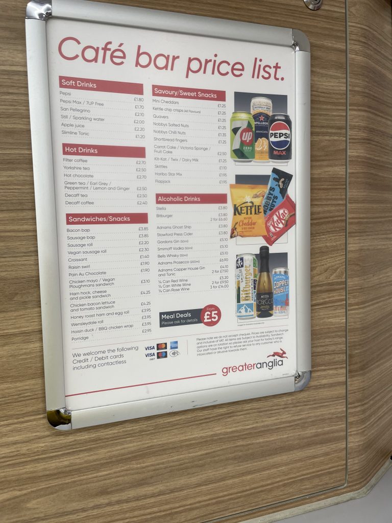 One of these operators is LNER. LNER has a to go counter where you can pick up things to take back to your seat, or you can order at your seat using the QR on the seat in front in second class.